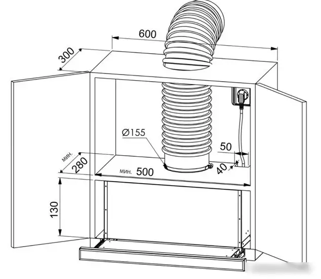 конструкция телескопическая, монтаж для встраивания, ширина 60 см, управление механическое/кнопочное, производительность мотора 520 м×/ч, цвет черный