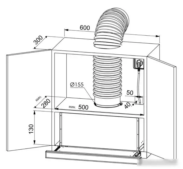 конструкция телескопическая, монтаж для встраивания, ширина 60 см, управление механическое/кнопочное, производительность мотора 520 м×/ч, цвет белый