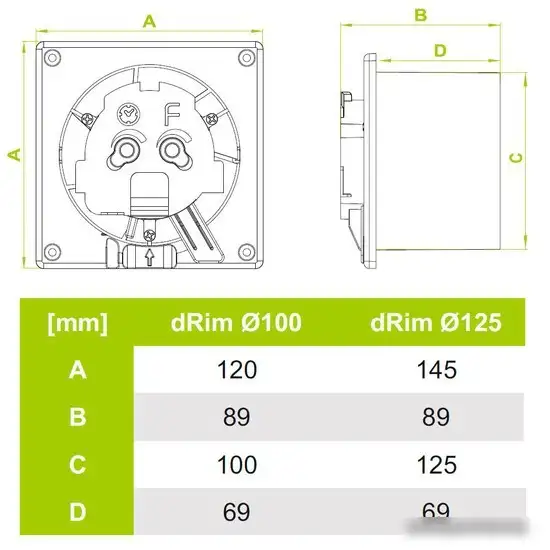 Осевой вентилятор airRoxy dRim 125HS BB предназначен для вентиляции ванных комнат, туалетов и кухонь. Он устанавливается накладным способом на потолке или стене с диаметром воздуховода 12,5 см. Модель обеспечивает хорошую производительность — до 140 кубометров воздуха в час, при этом работает тихо — уровень шума составляет всего 36 дБ. Мощность вентилятора равна 10 Вт, он вращается со скоростью около 2400 об/мин, что обеспечивает эффективное вытяжание воздуха. В устройство встроены кнопка включения, выключатель света и датчик влажности, что делает управление удобным. Вентилятор выполнен из пластика и стекла, защищен по стандарту IPx2, что позволяет использовать его в помещениях с высокой влажностью. Благодаря съемной внешней панели легко проводить чистку и техническое обслуживание. Он не имеет обратного клапана, поэтому воздух может свободно выходить. Размеры прибора — ширина и высота по 14,5 см, глубина 6,9 см, он компактный и занимает мало места.