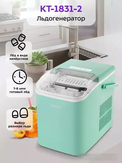 Льдогенератор Kitfort KT-1831-2 легко произволнит качественный лёд для ваших напитков. Он работает на мощности 100 Вт, что обеспечивает быстрое и эффективное производство льда. Корпус изготовлен из прочного пластика и имеет мятный цвет, что делает его стильным и приятным в использовании. Устройство оснащено одной емкостью объемом 1500 мл, в которой можно быстро изготовить достаточное количество льда. Льдогенератор не содержит таймера, поэтому вы можете управлять процессом самостоятельно. Длина шнура в 1,7 метра позволяет свободно размещать его на кухне. Компактные размеры: длина 330 мм, ширина 250 мм, высота 295 мм, позволяют легко найти место для хранения. Вес устройства составляет 7 кг, оно устойчиво и не занимает много места на столе. Благодаря простому дизайну и удобству использования, этот льдогенератор отлично подойдет для дома и кафе.