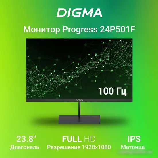 Монитор Digma Progress 24P501F имеет диагональ 23,8 дюймов и разрешение 1920x1080 пикселей, что вполне подходит для работы в офисе и серфинга в интернете. Экран выполнен на IPS-матрице с яркостью 250 кд/м² и контрастностью 1000:1, обеспечивает хорошие цвета и четкое изображение с углами обзора до 178 градусов. Он поддерживает технологию AMD FreeSync для плавного отображения видео и имеет частоту обновления 100 Гц, что помогает снизить размытие. Монитор оснащен двумя встроенными динамиками мощностью 1 Вт каждый, а также портами HDMI, DisplayPort и VGA. Он легкий и компактный — вес составляет всего 3 кг, а размер — 539х418х164 мм. Корпус выполнен в черном цвете и имеет безрамочный дизайн. Если нужно, его можно закрепить с помощью крепления VESA 75x75 мм. Основная сфера использования — офисная работа и интернет-серфинг, что делает его удобным и практичным выбором.