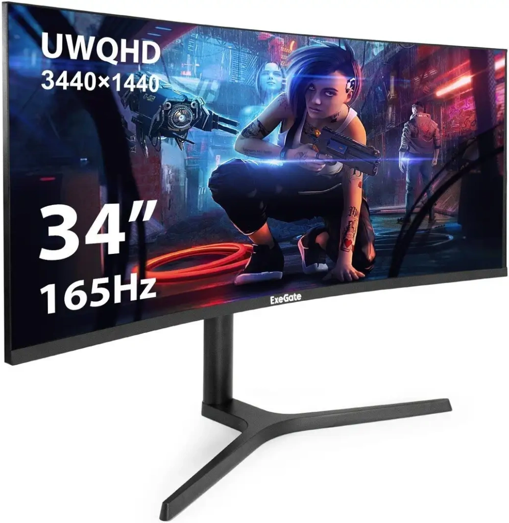 34", 3440x1440, 21:9, изогнутый, кривизна 1800R, VA, 165 Гц, глубина 8 бит, яркость 300 нит, динамики, HDMI+DisplayPort, регулировка высоты